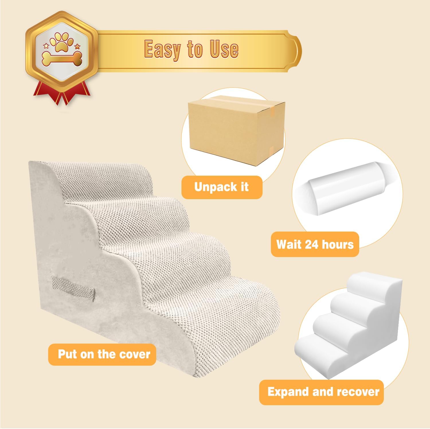 - Quick and Easy Assembly: Our dog stairs to bed are vacuum compressed for easy storage and shipping. Once removed from the packaging, our stairs quickly regain their original shape and size, requiring only 24 to 48 hours to completely expand to their maximum size.