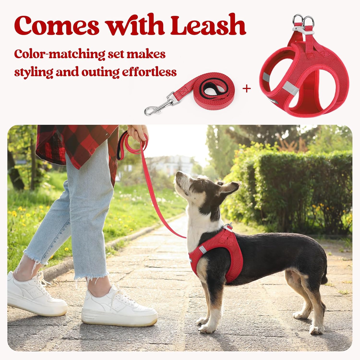 - Dog Harness with Leash Set: The color-matching harness and leash with reflective bands make it fashion and visible for pet outing. The leash is 5.12ft in length, with an anti-tangling clip and a palm-friendly handle