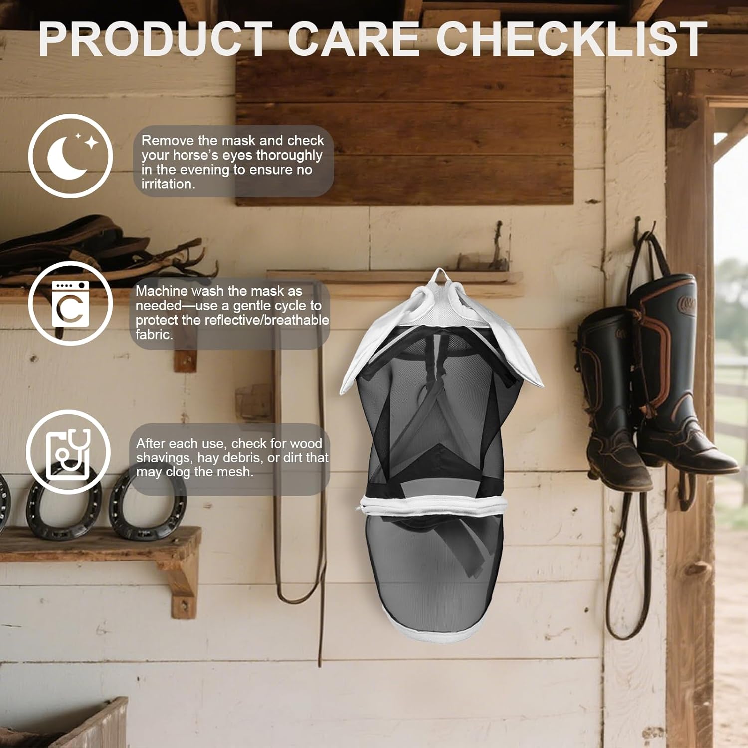 - 【High-Spec UV & All-Scenario Pest Defense】 Our lab-certified horse fly mask, an anti-fly mesh horse mask with UV protection, blocks 60%-90% of UV rays. This fly mask for horses shields light-skinned or blue-eyed horses from sunburn and infections. The dense micro-mesh of our fly mask covers face, eyes, ears, and nose, fending off horseflies, ticks, and pollen. Suitable for grazing to riding, our fly masks for horses with ears—including pony and mini horse options—ensure all-scenario protection.