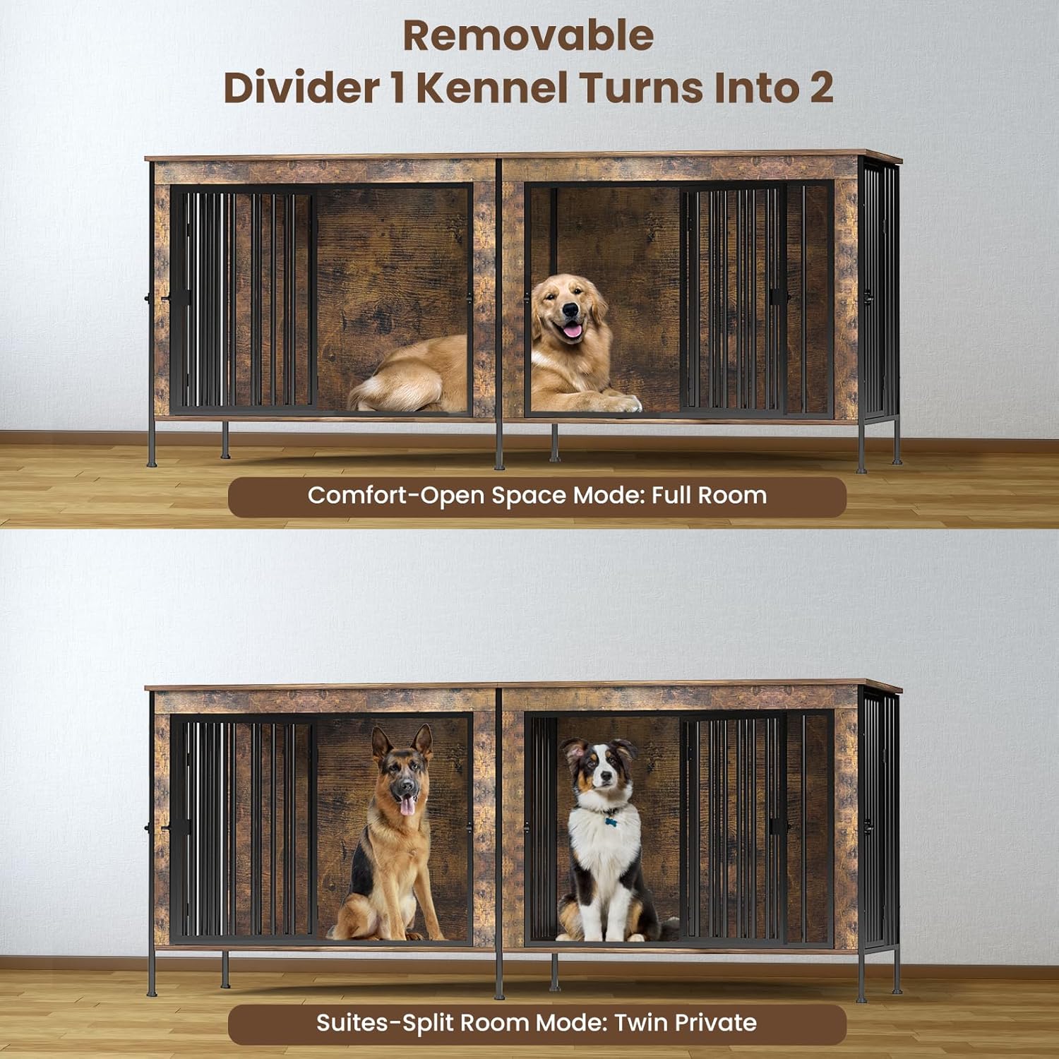 - Room for Two Large Dogs: At 78"L × 27.5"W × 33"H, this TimberAura dog crate furniture offers two roomy dens so Golden Retrievers or German Shepherds can lie flat and turn comfortably. The built-in center divider creates two separate dens, giving each dog its own space and helping reduce stress during feeding or rest.