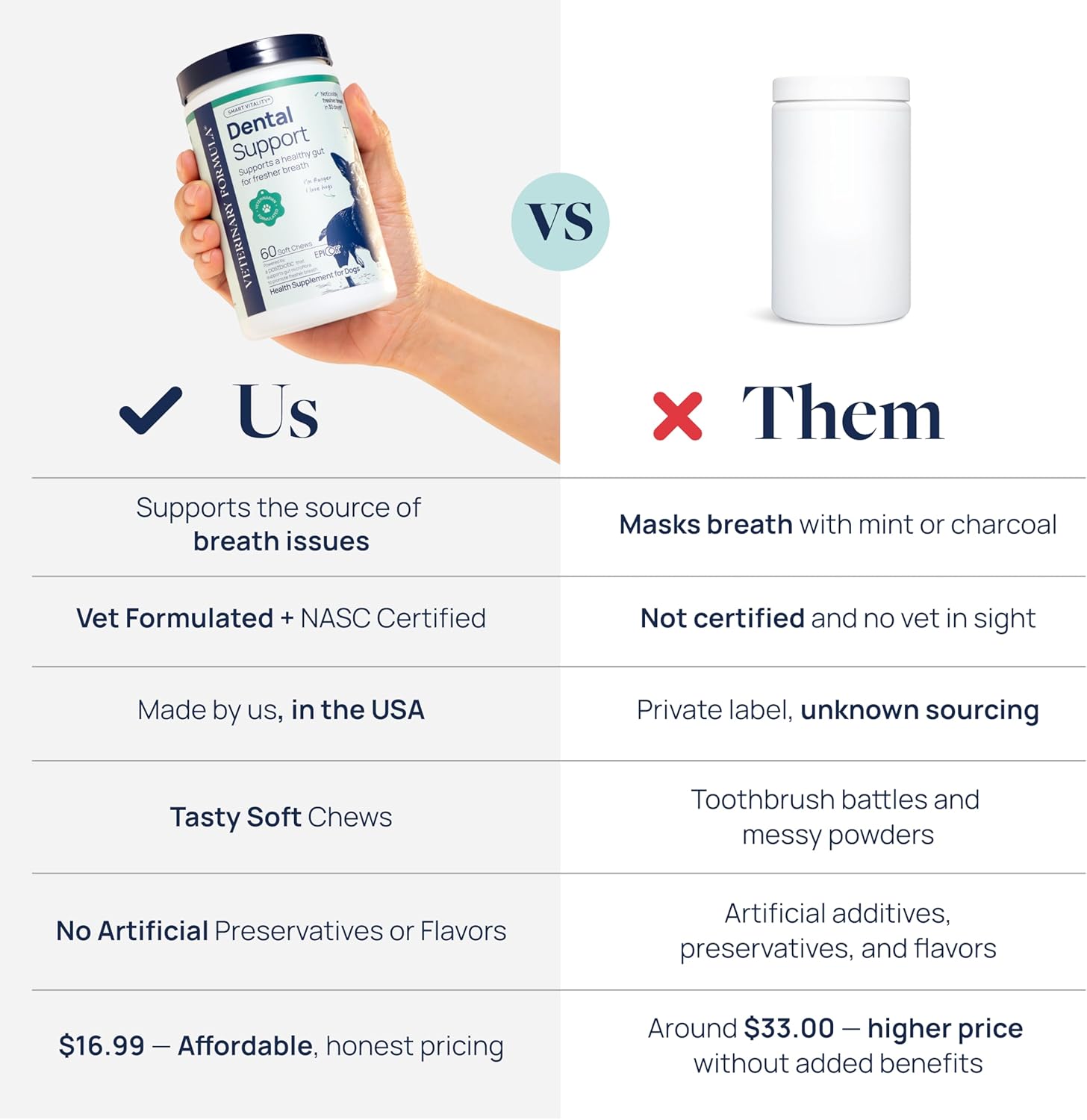 - DENTAL SUPPORT FOR DOGS – Smart Vitality Dental Health Supplement supports fresh breathand ongoing oral health in dogs. These soft chews are ideal for daily use, helping maintain clean teeth and a healthier mouth as part of your pet’s wellness routine.
