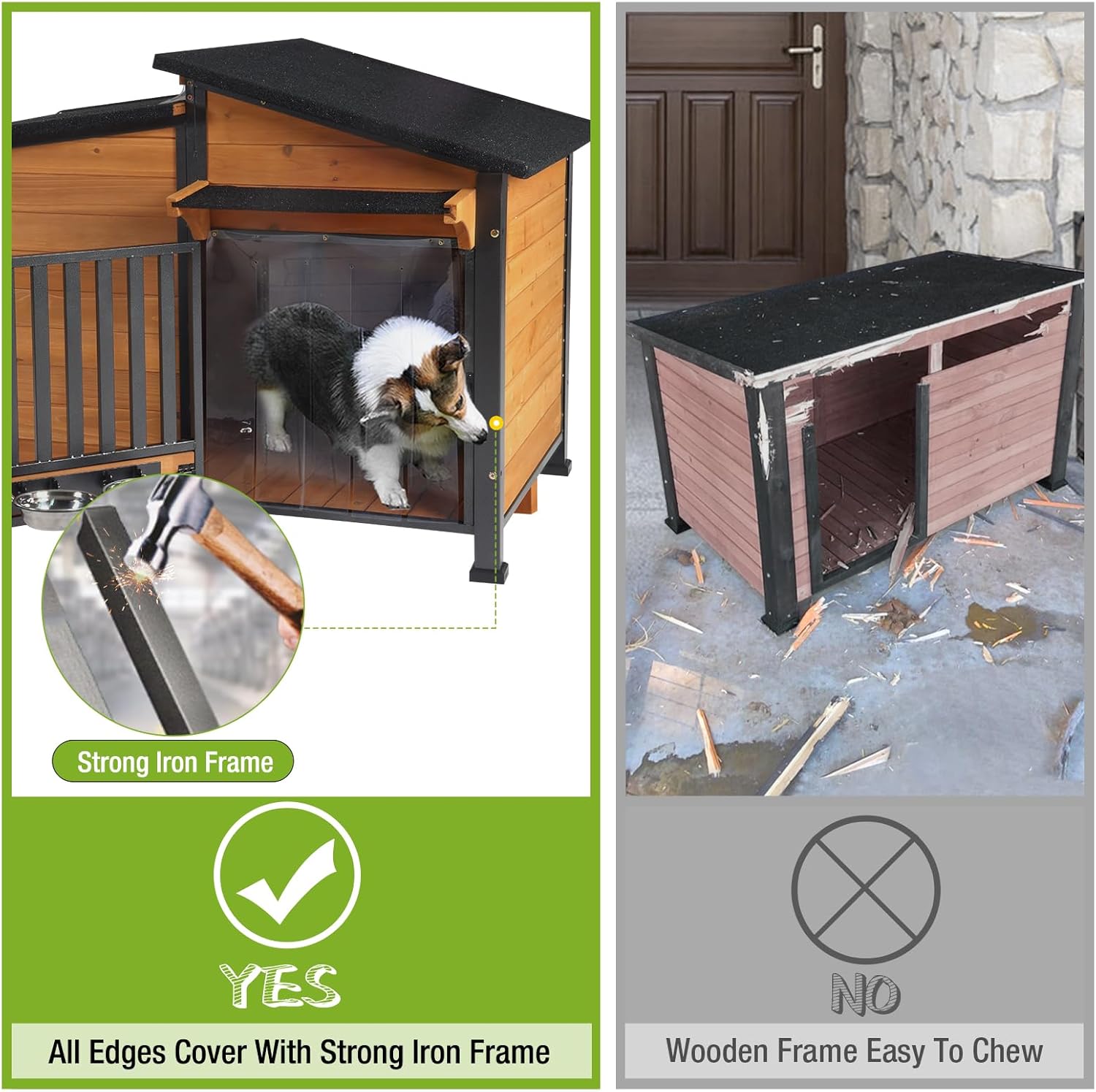 - Reinforced Metal Frame: Each wooden panel is fully framed with heavy-duty metal and secured by metal connecting bars, making the structure far stronger than thin aluminum trims or plain wood dog house