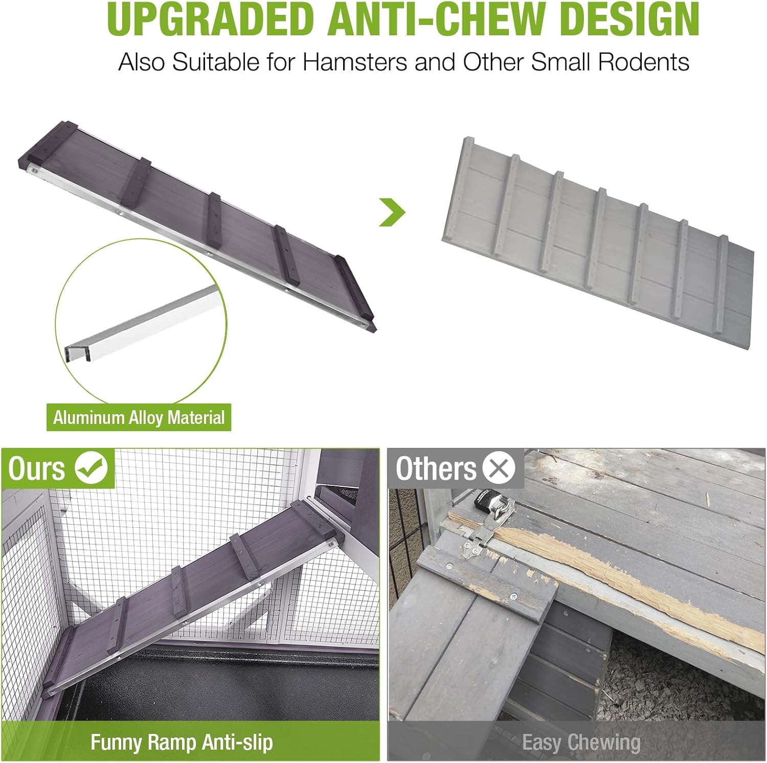 - CHEW-PROOF RAMP FOR RABBITS: The ramp features aluminum edges to prevent destructive chewing, while its slip-resistant surface ensures stable, secure hopping. Your bunny can move between levels confidently without risk of slips or damage to the indoor rabbit hutch