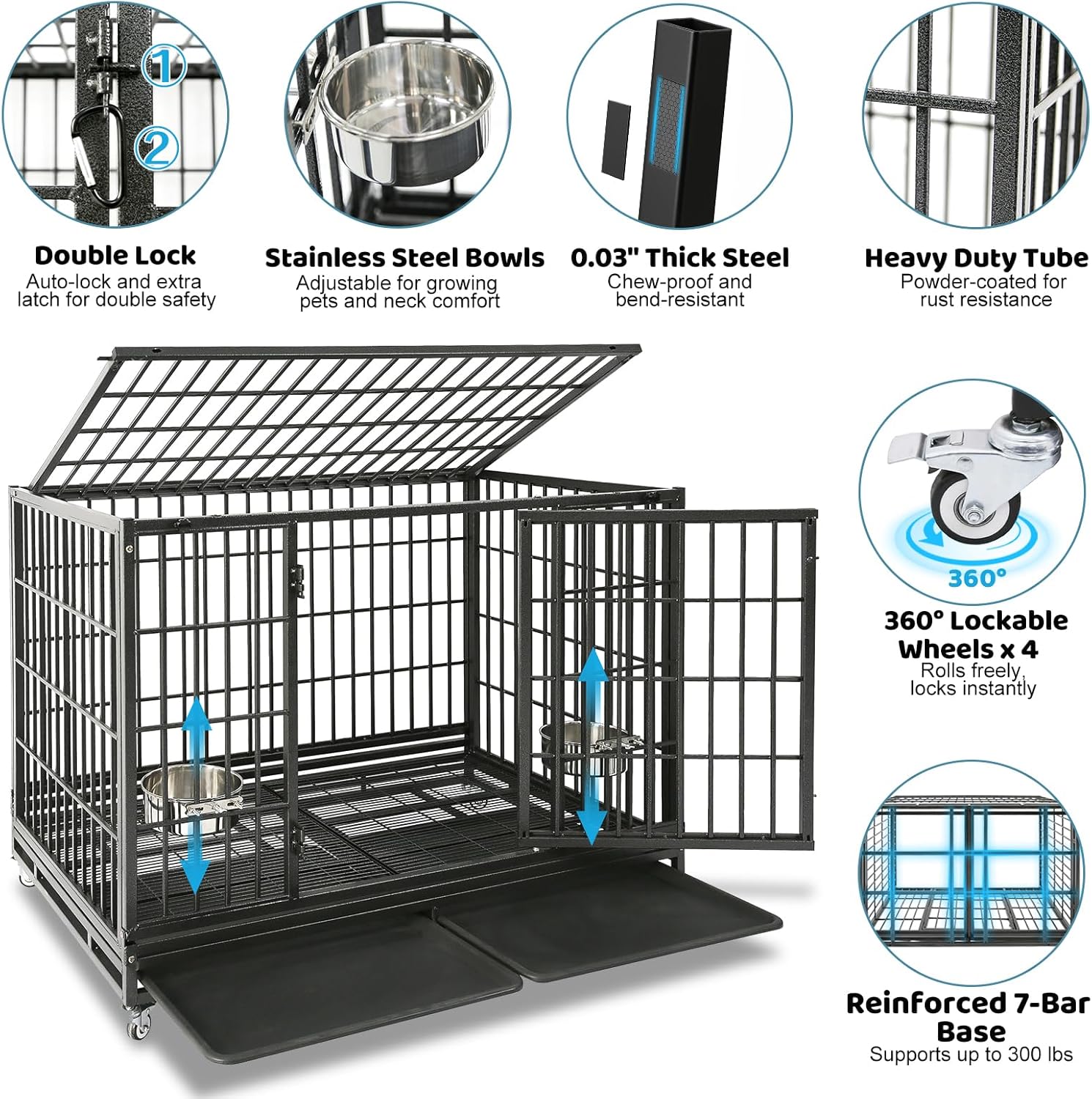 48 Inch Heavy Duty Large Dog Crate, Stackable Indestructible Big Cage for High Anxiety Dogs, Foldable Escape Proof XL Dog Kennel Indoor with Adjustable Bowls, Wheels and Double Trays(2 Pack)