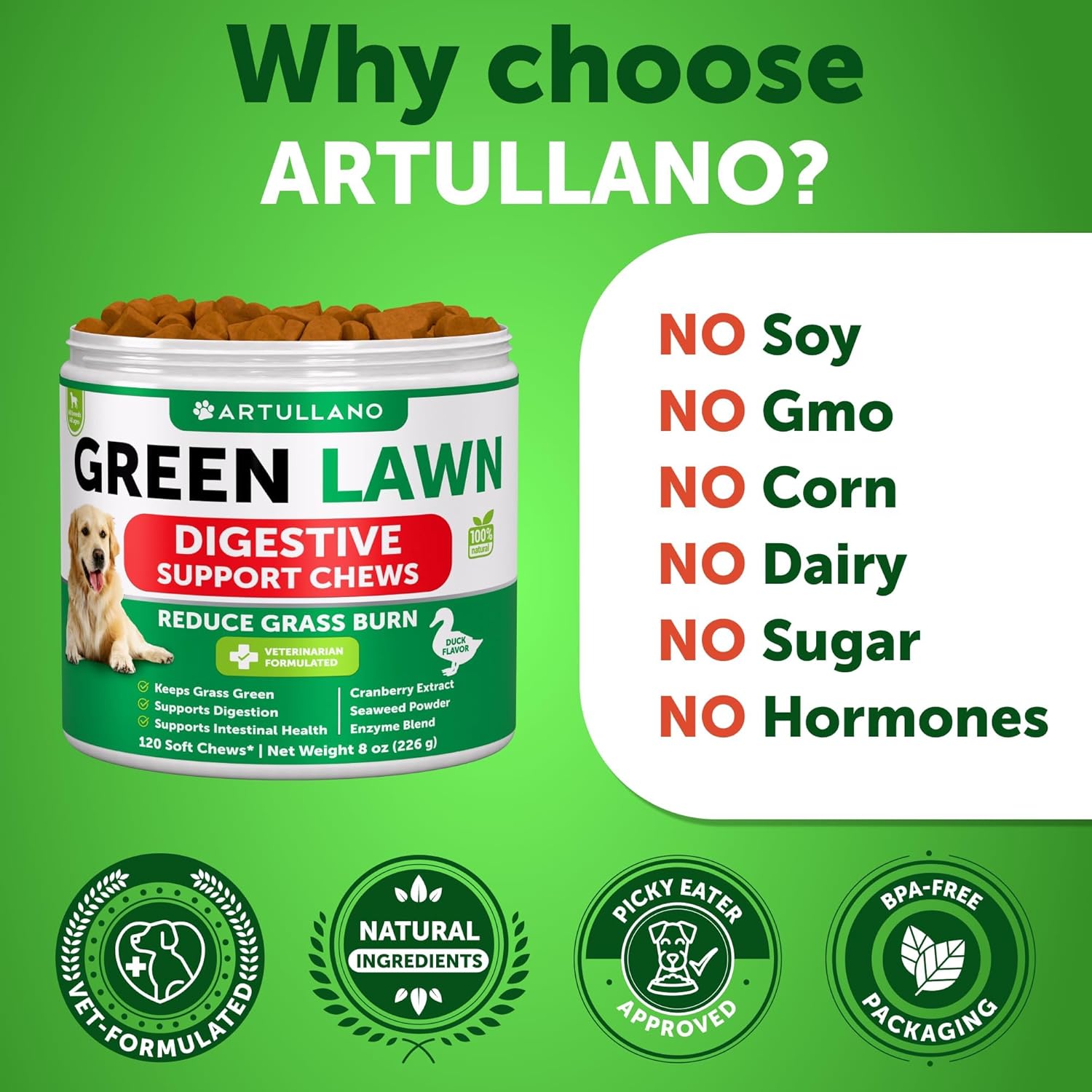 - Tasty & Effective Chews: natural dog grass pills come in a soft chew form that your dog will eat and enjoy. Our chews are fun-to-use as they have a yummy duck flavor & appealing scent.